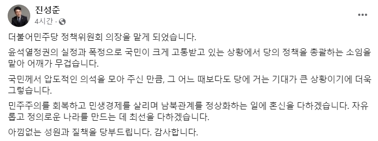 정책위의장으로 선임된 진성준 의원은 이번 총선에서 서울 강서을 지역구에서 당선된 의원으로 그간 대통령비서실과 서울시 정무부시장을 역임하면서 정치 및 정책 결정 과정에서 중추적인 역할을 해왔습니다.